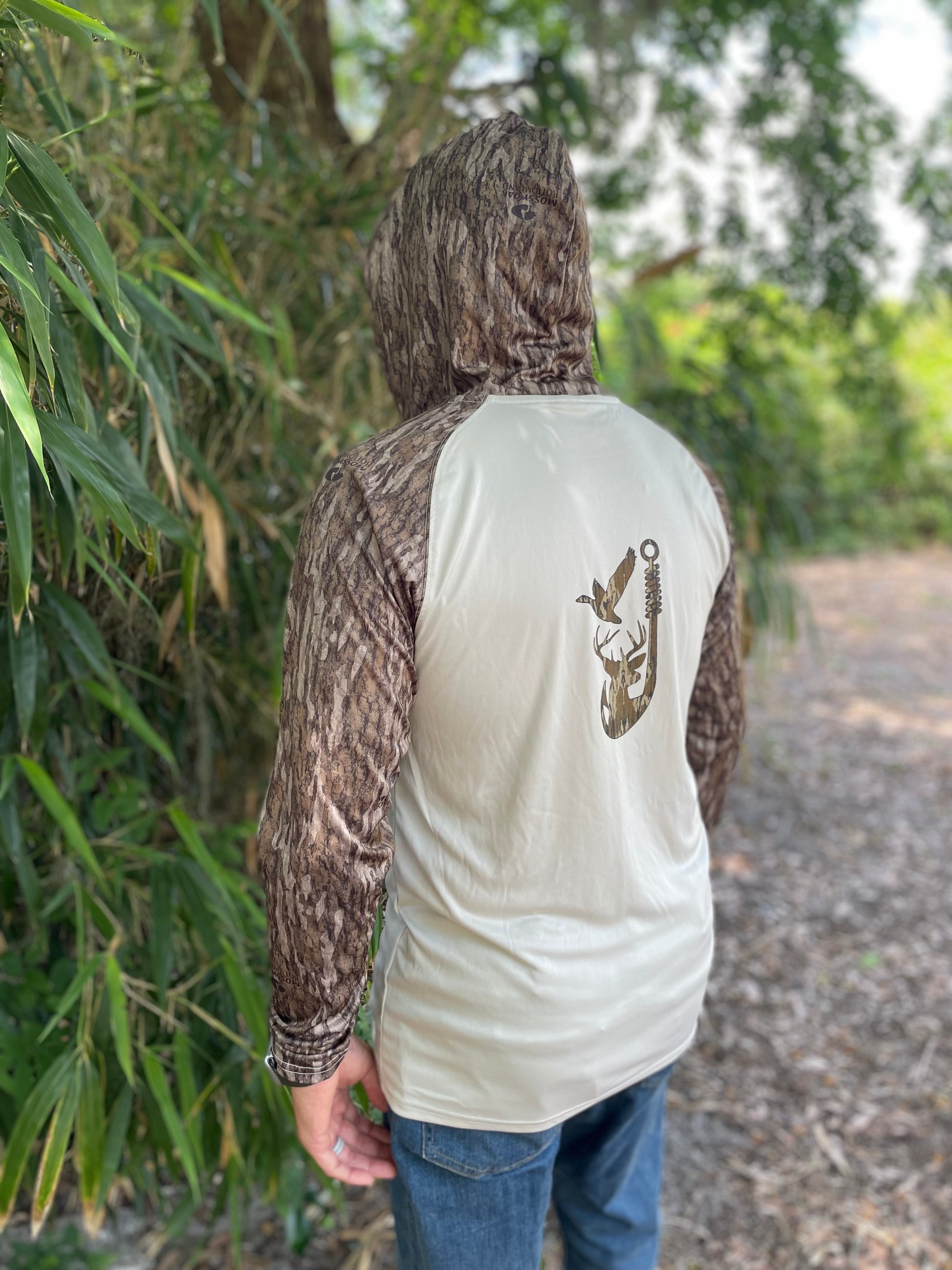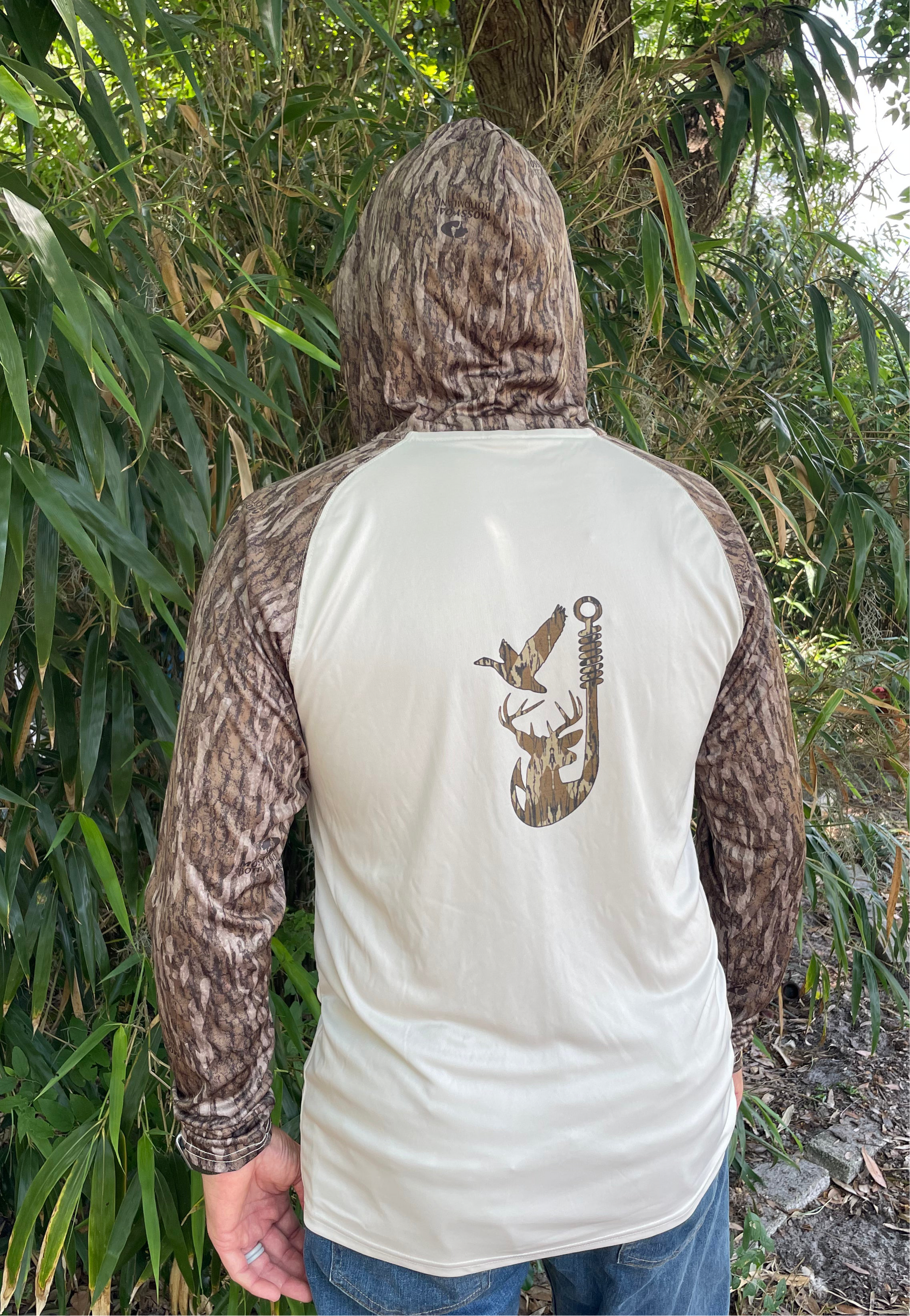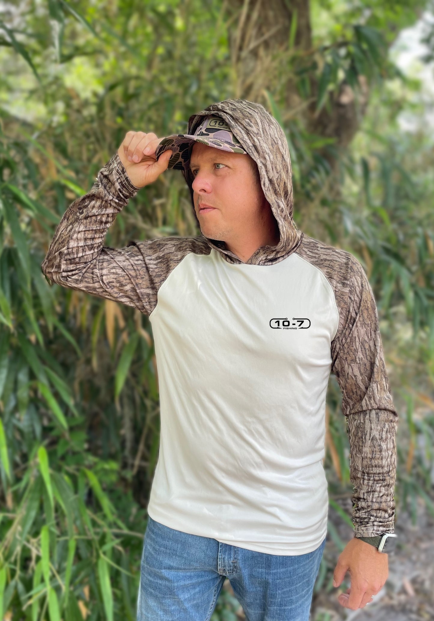 Hooded Bottomland camo fishing shirt with 10-7 logo on the front and cool fishing hunting mashup graphic printed on the back also in bottomland. The graphic is printed directly to garment so there is none of the shirt sticking to you while out in the sun. UPF50 sweat wicking fabric