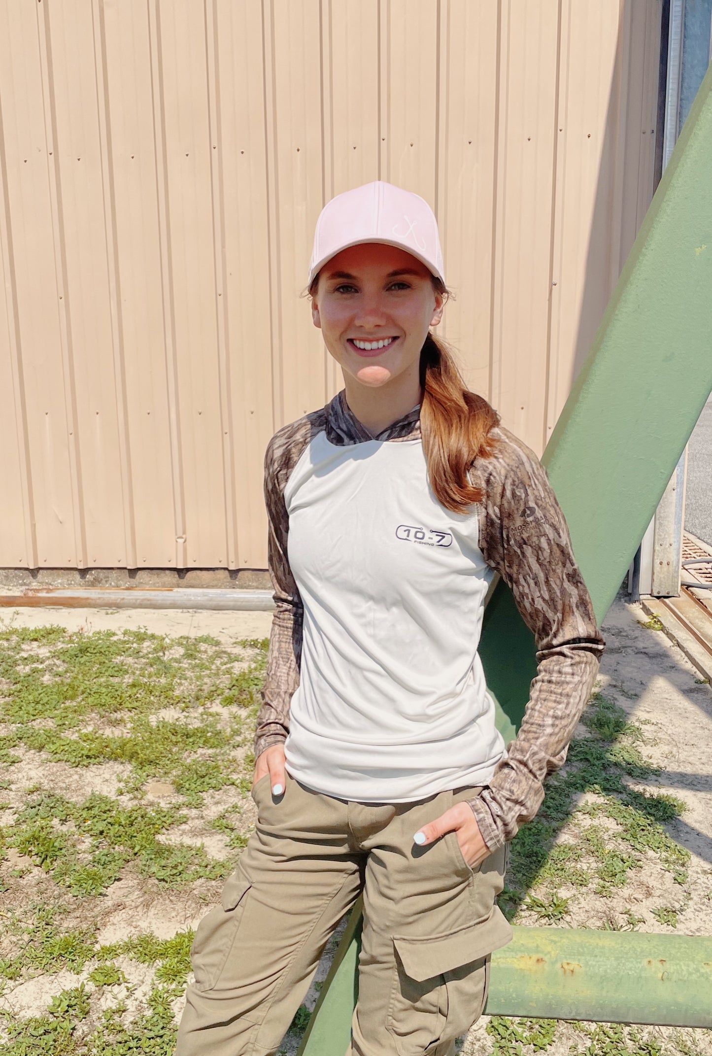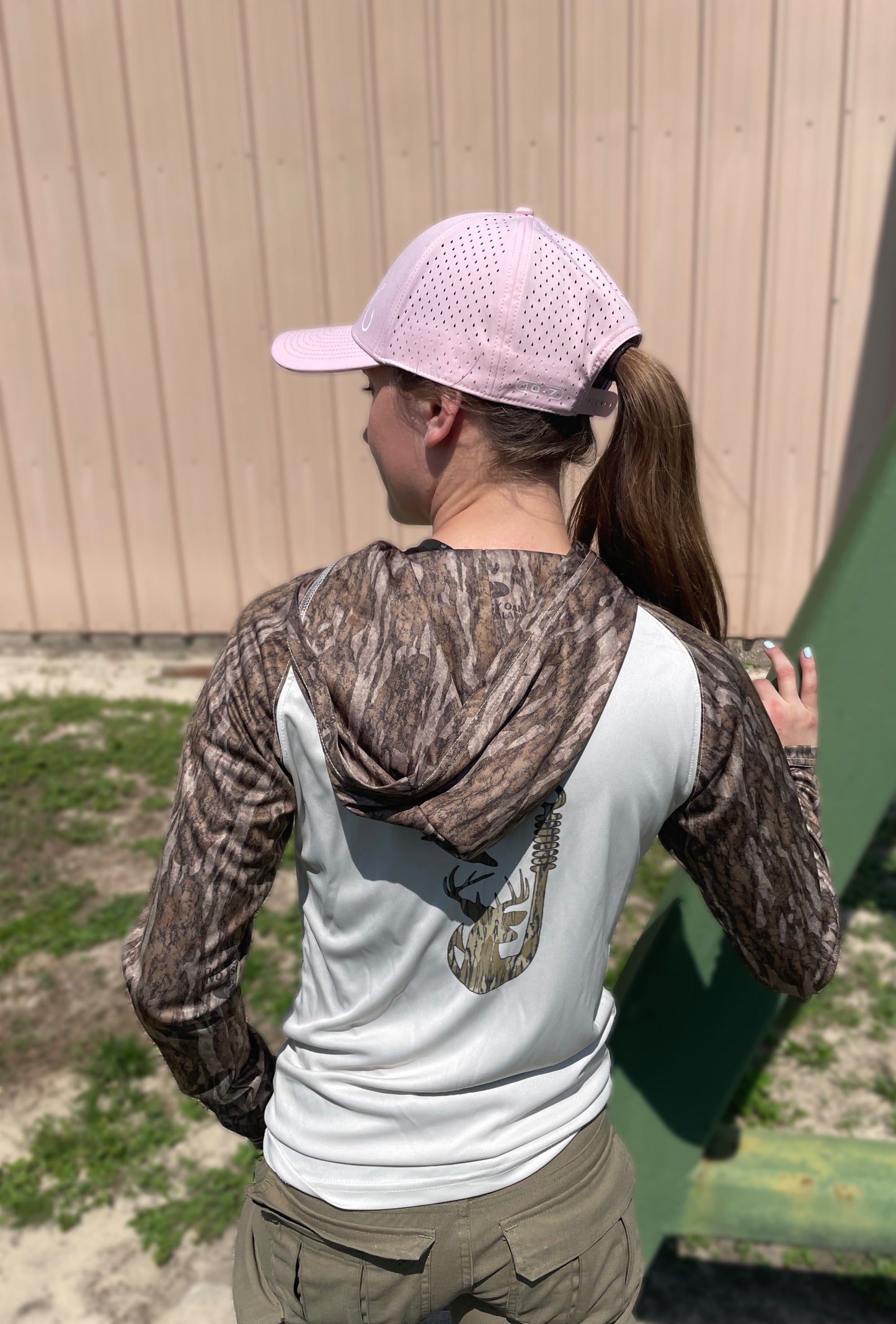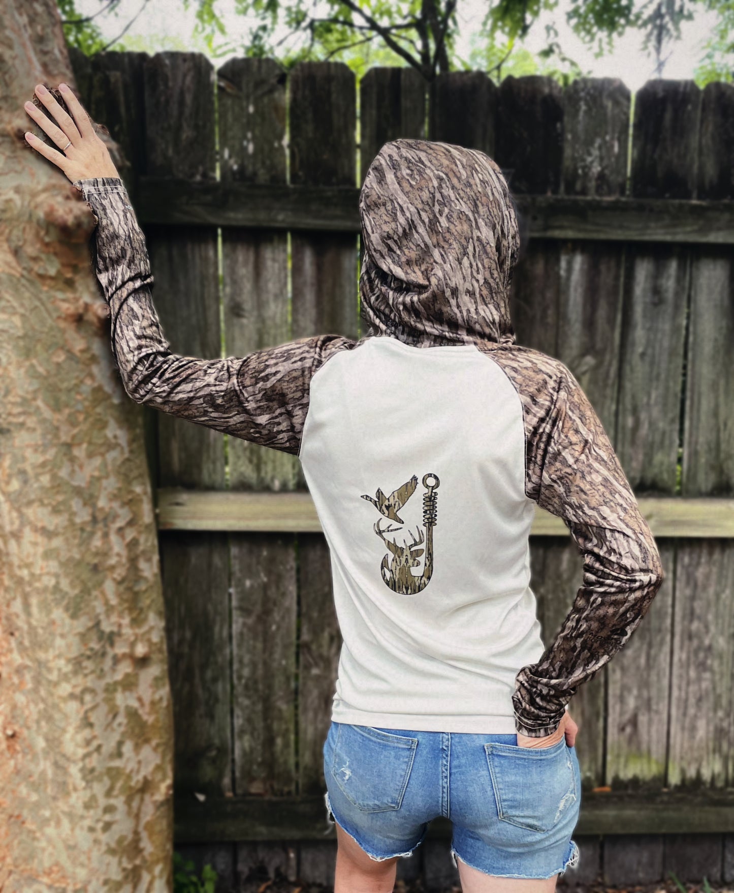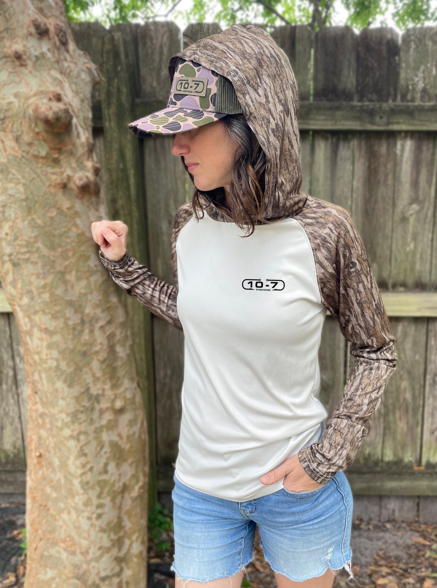 Hooded Bottomland camo fishing shirt with 10-7 logo on the front and cool fishing hunting mashup graphic printed on the back also in bottomland. The graphic is printed directly to garment so there is none of the shirt sticking to you while out in the sun. UPF50 sweat wicking fabric