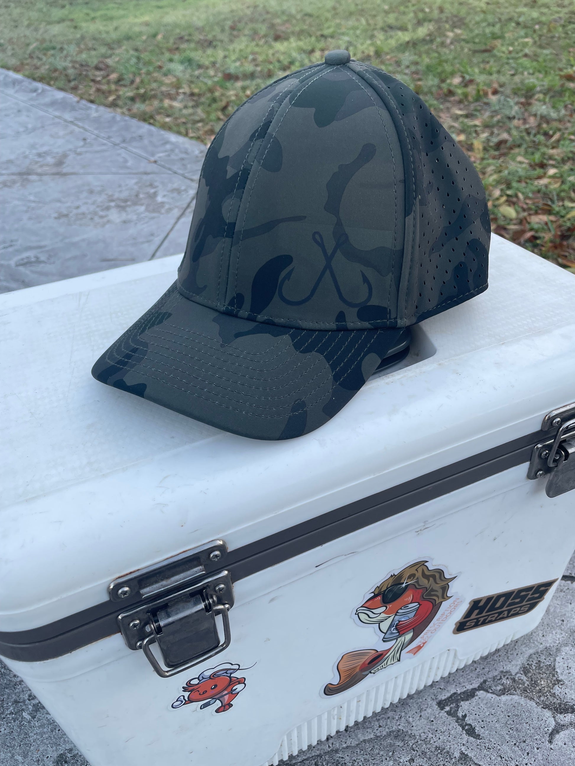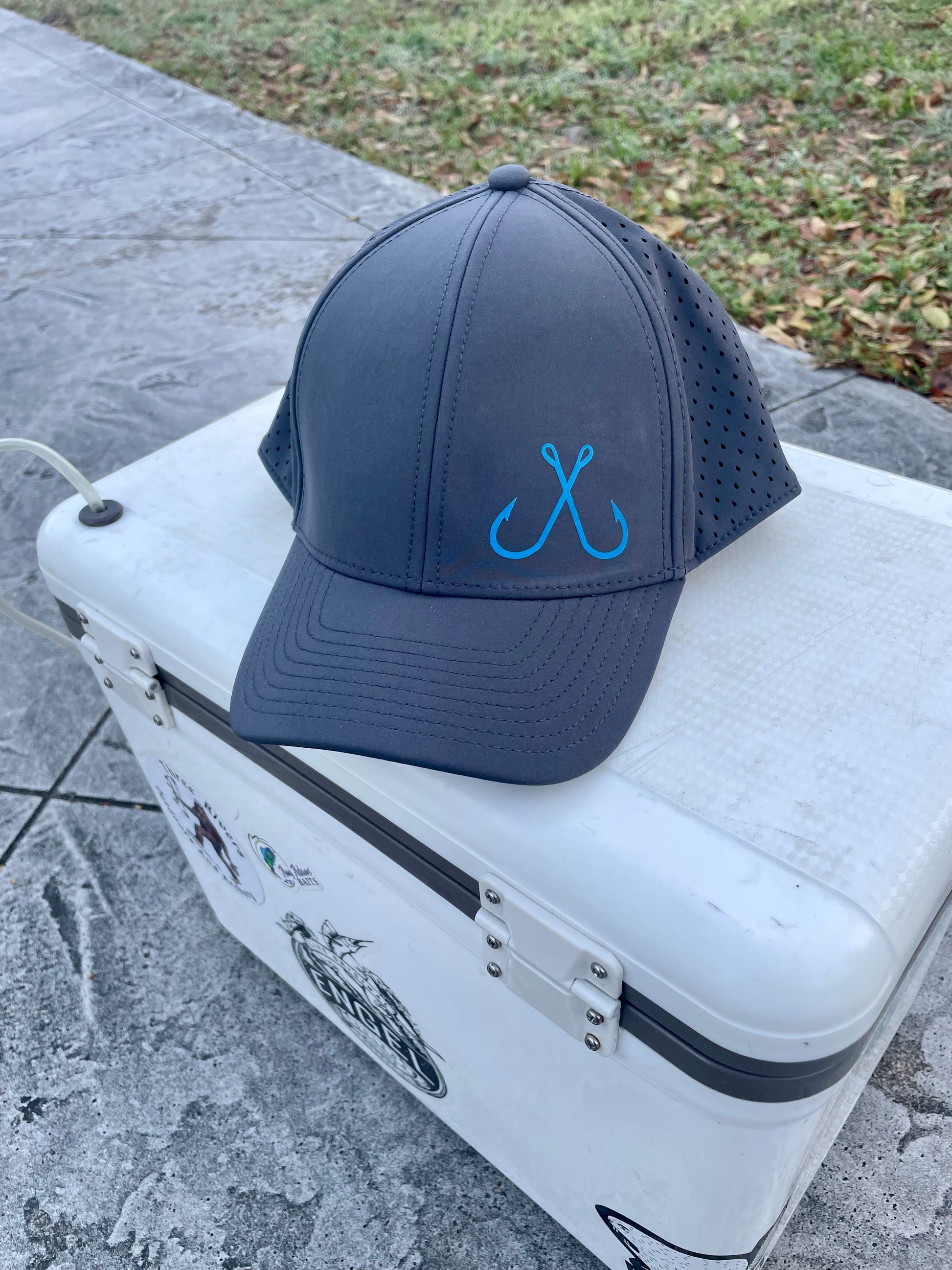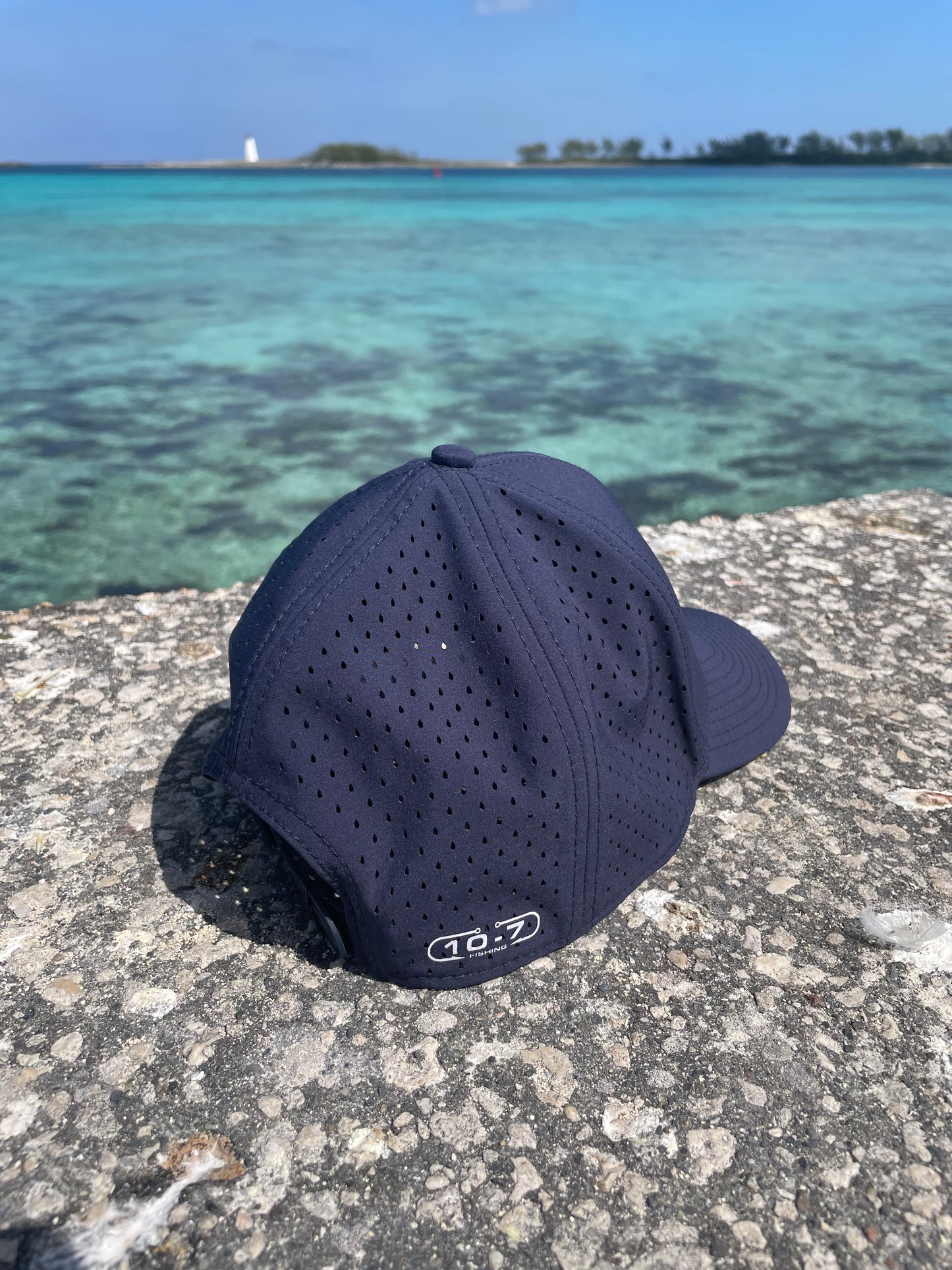 Performance sweat wicking and water resistant light weight hat with fishing hooks graphic on the front and 10-7 fishing logo on the back. This hat is light, super comfortable, and perfect for hot summer days out on the water. Snapback hat comes in 4 colors navy blue, graphite, woodland camo, and pastel pink.