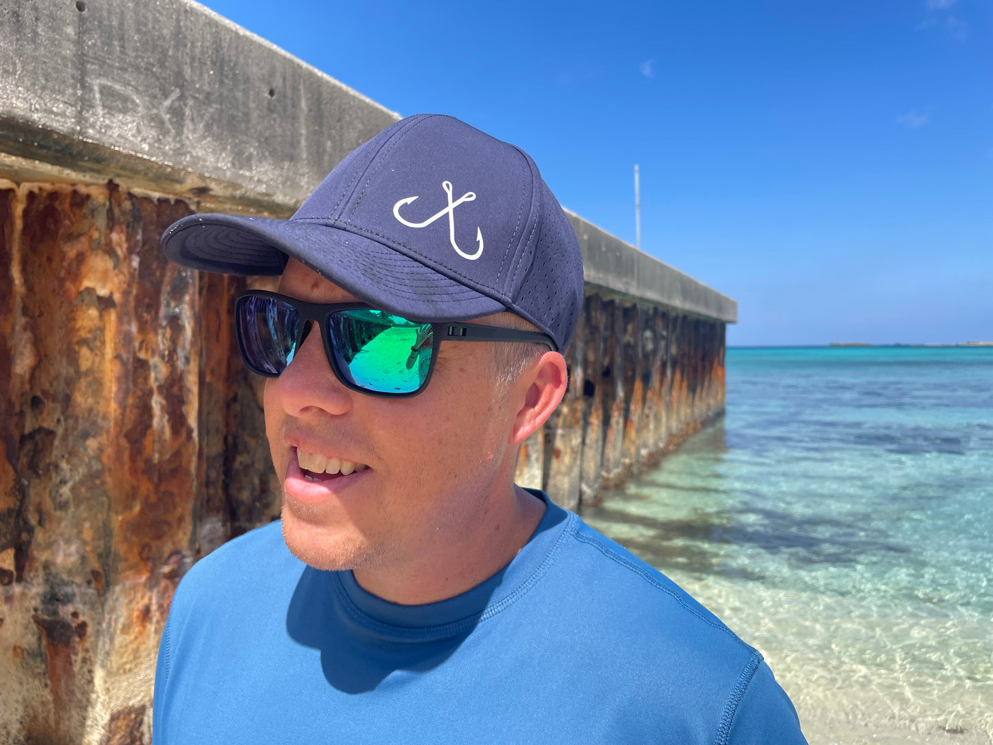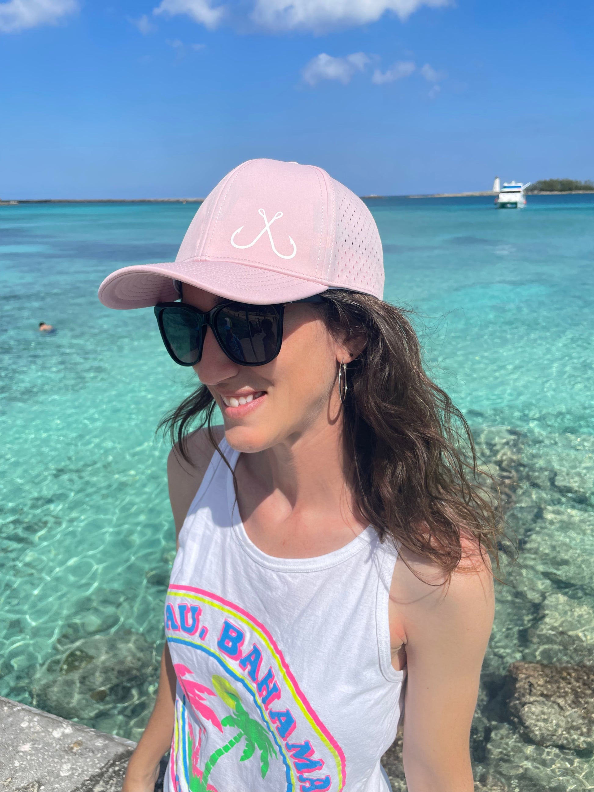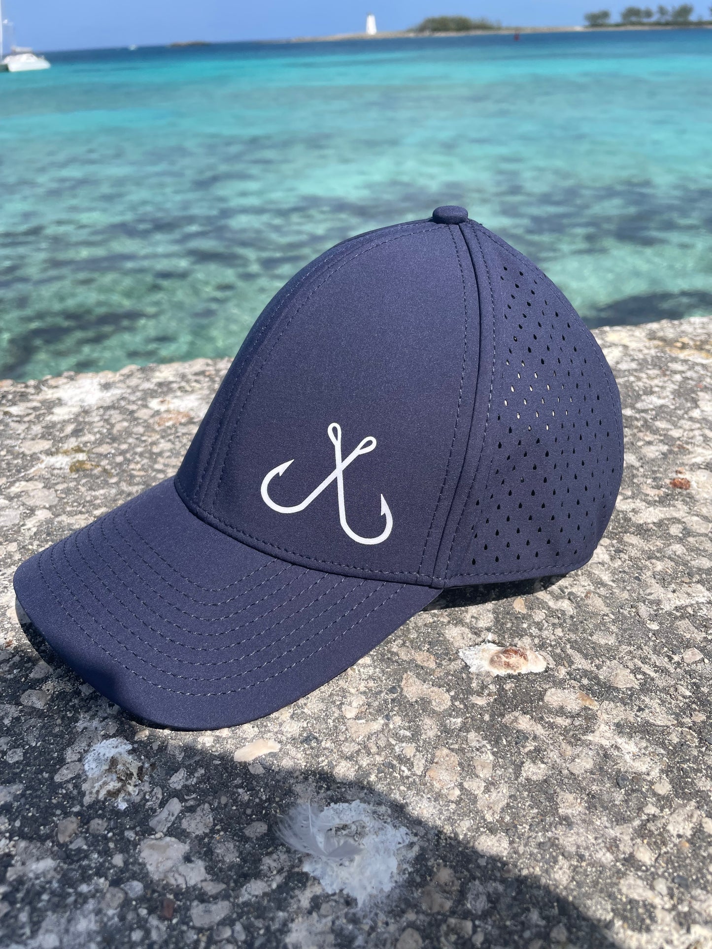 Performance sweat wicking and water resistant light weight hat with fishing hooks graphic on the front and 10-7 fishing logo on the back. This hat is light, super comfortable, and perfect for hot summer days out on the water. Snapback hat comes in 4 colors navy blue, graphite, woodland camo, and pastel pink.