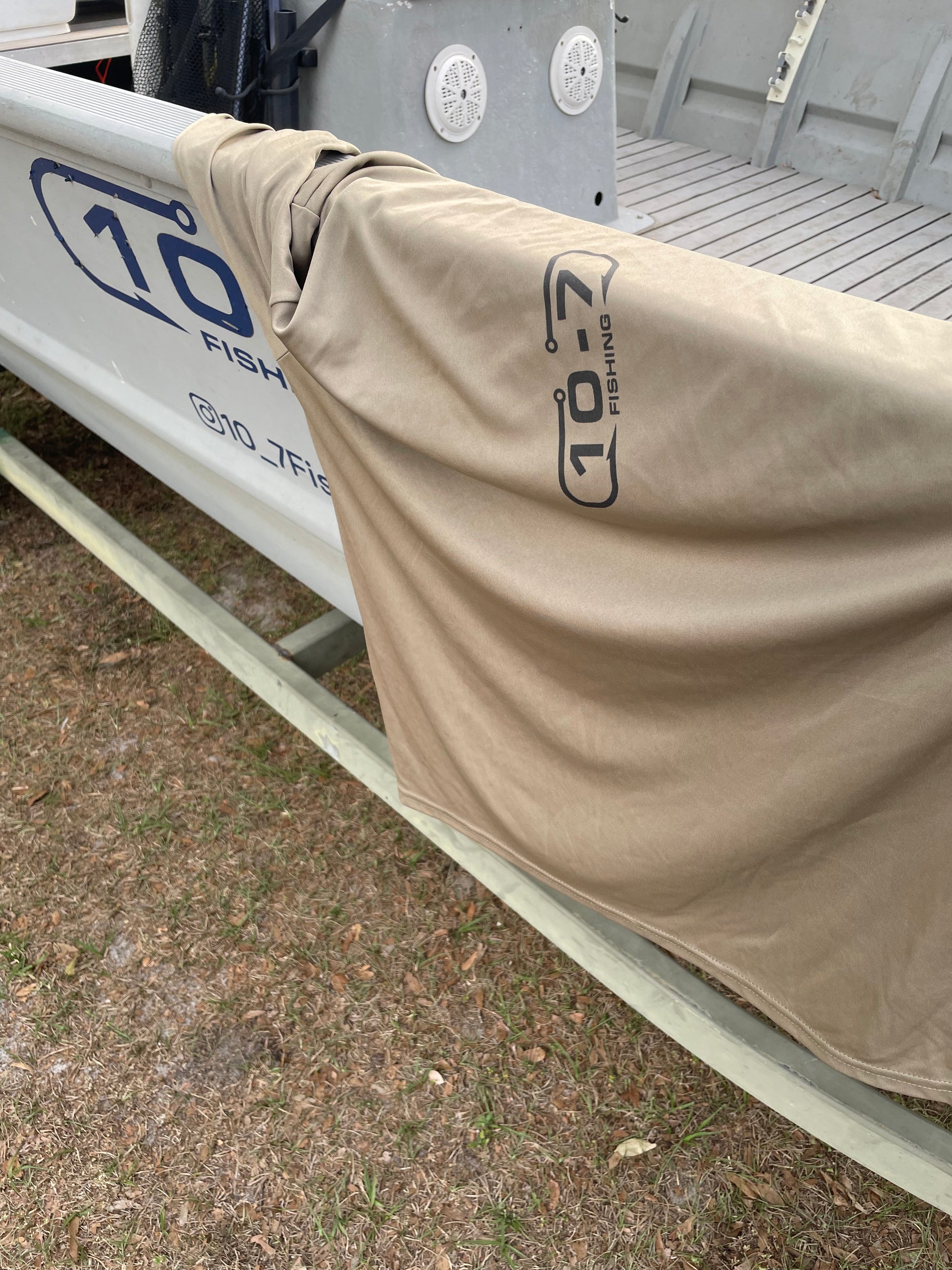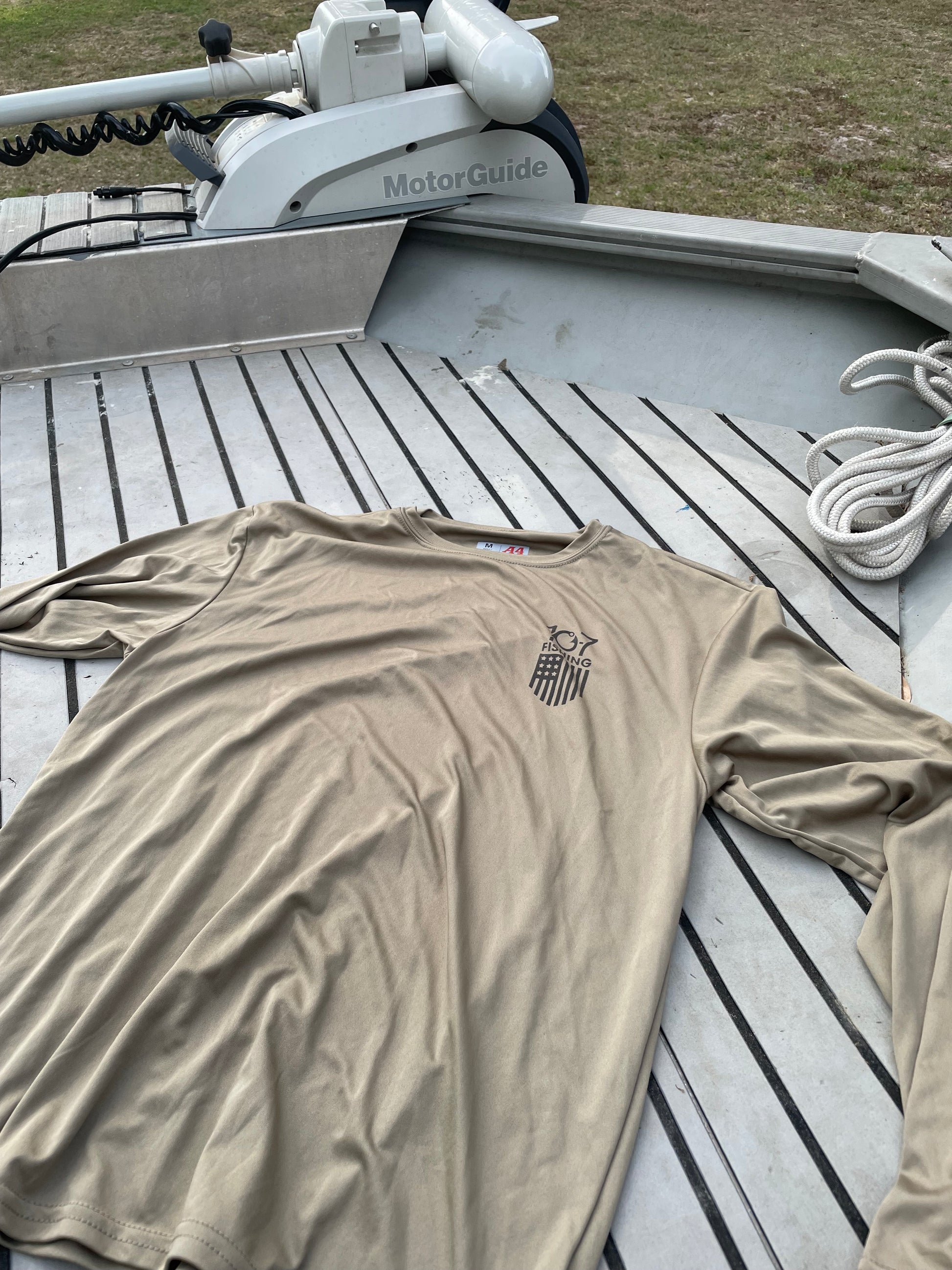 Sand color long sleeve UPF sweat wicking shirt with black graphics printed directly onto the fabric. DTG printing