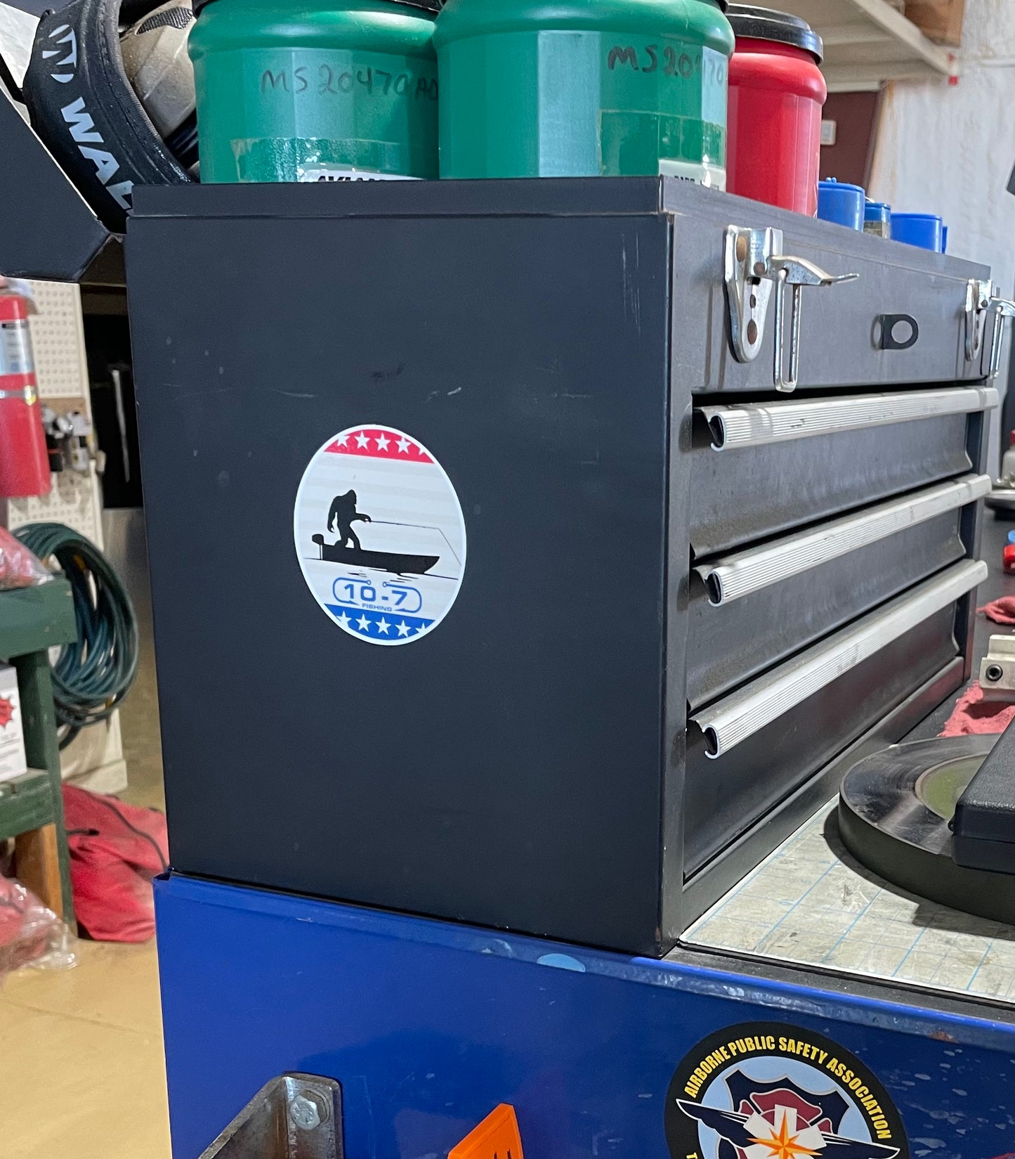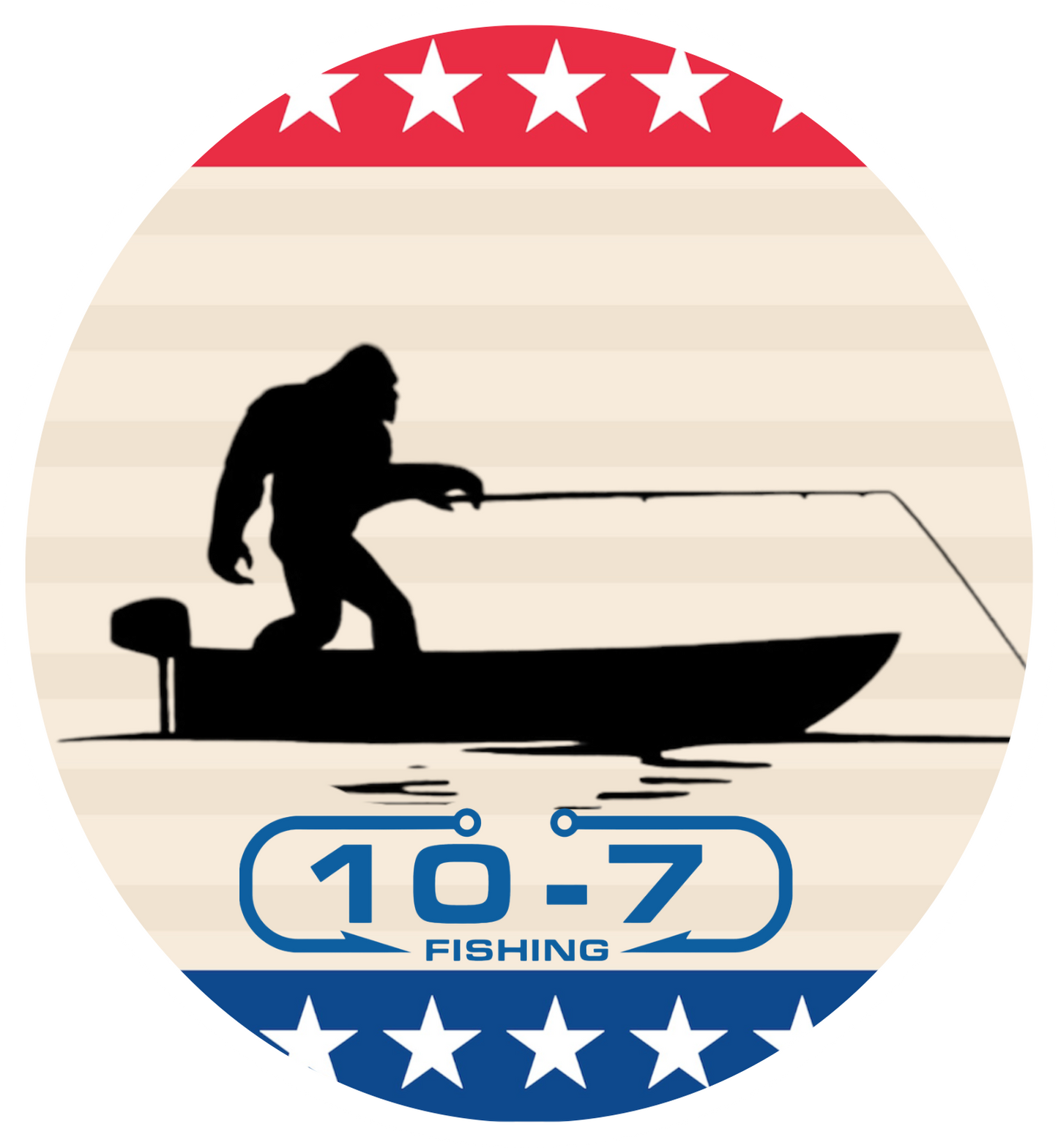 2.5” round vinyl sticker with Sasquatch fishing in a boat with a patriotic red whit and blue stars background. What’s more American than that!